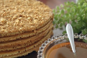 Cand incepe sa fiarba se deasupra punem un tocator ceva mai mare si asezam ceva mai greu. Cu cat va fi mai mult zahar ars in tigaie, cu atat va rezulta o prajitura mai insiropata.